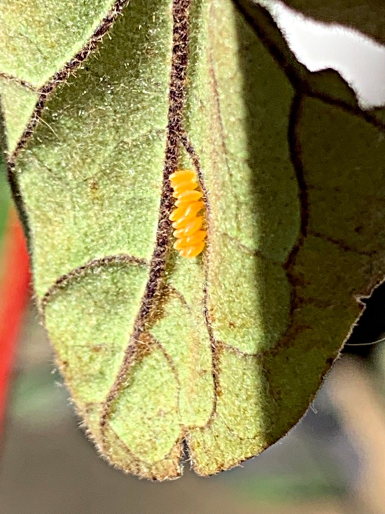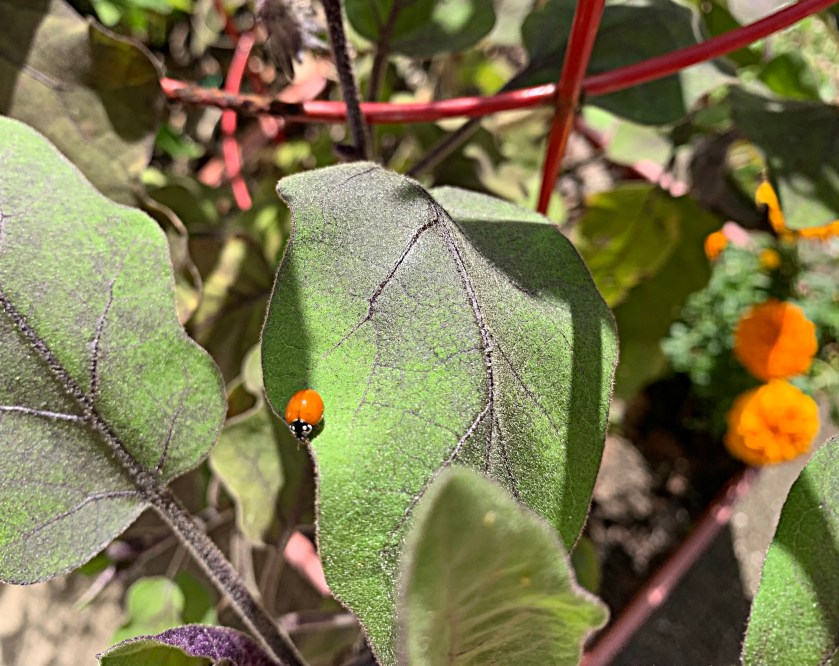 There is a very large brown lizard that loves to hang out on the eggplant plant (see him below). I have seen some green aphids, and maybe he is eating those. But aphids are also ladybug food. The lizard could be eating ants, or something else. I’m wondering if he will gobble up the baby ladybugs too.