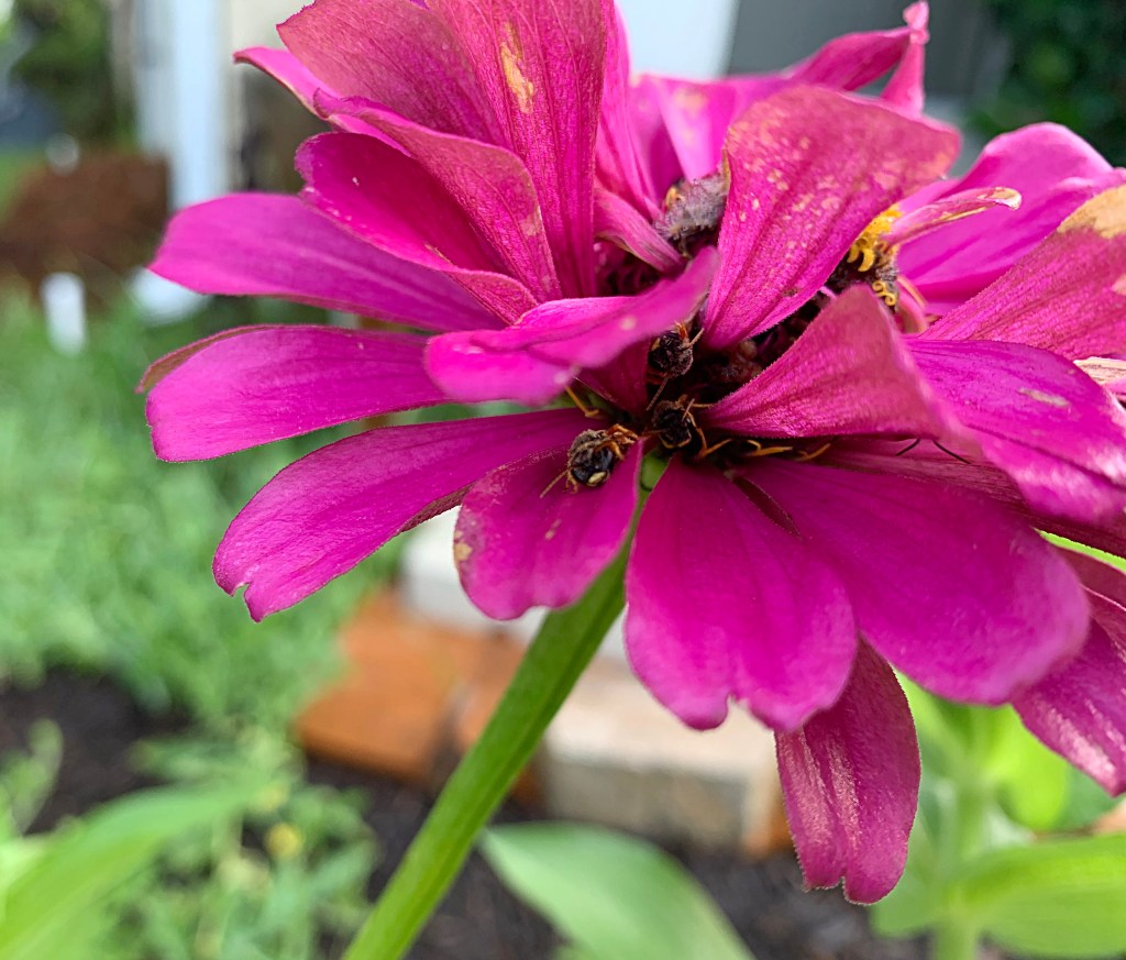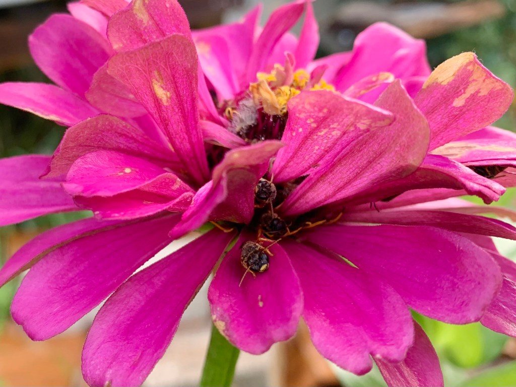 This magenta zinnia, which has a fading bloom, seems to be a favorite for little bees. They look like honey bees, and they crawl way up under the petals toward the center of the flower. I counted four bees, but I believe there were more.