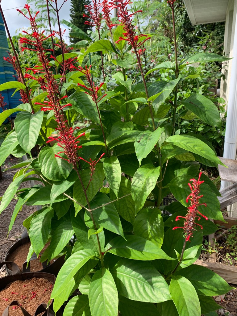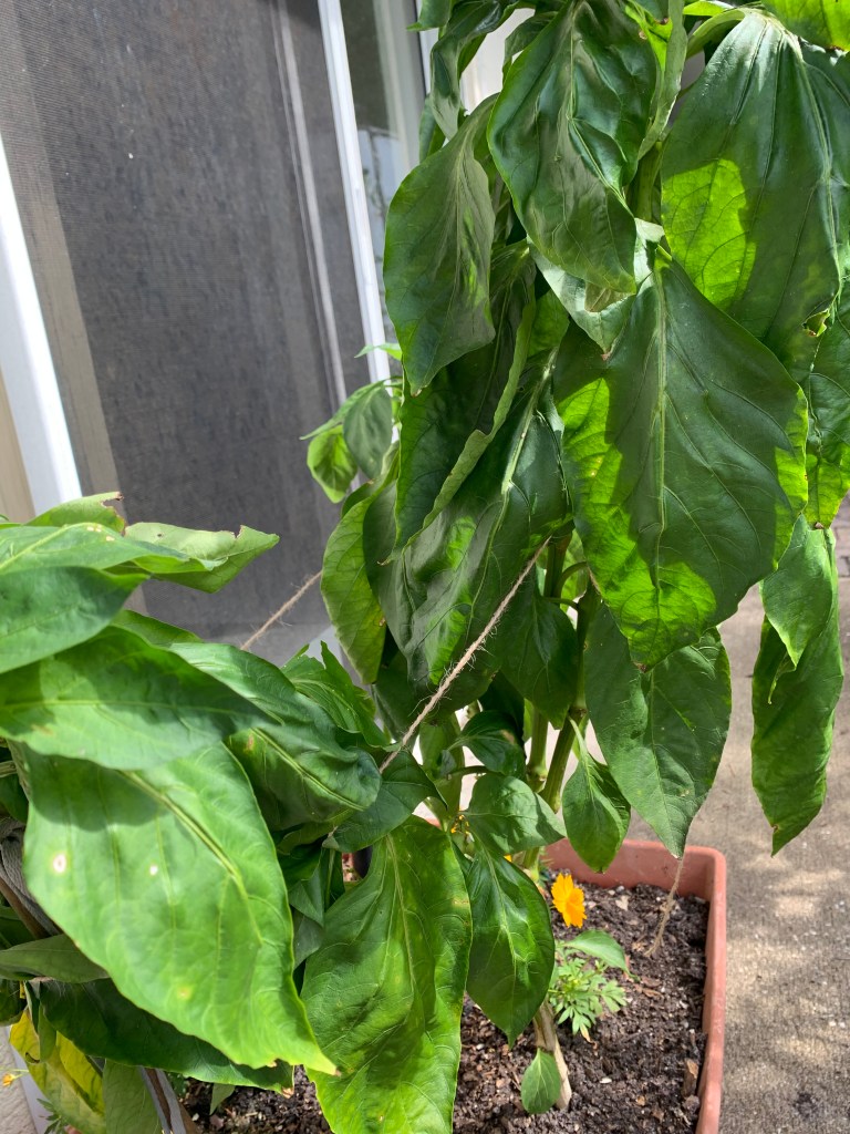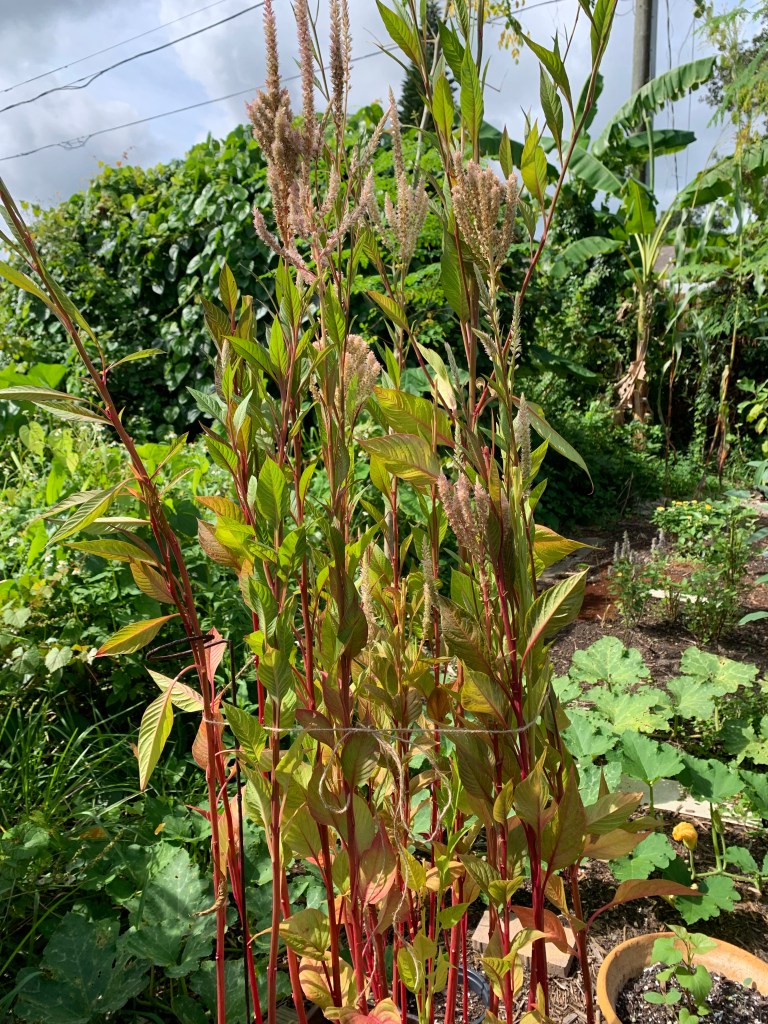 In the garden, all I’ve done is tie up some of the taller plants. This includes the Celosia and Firespike flowering plants. The bell pepper is lanky, so I tied a rope around it as well.