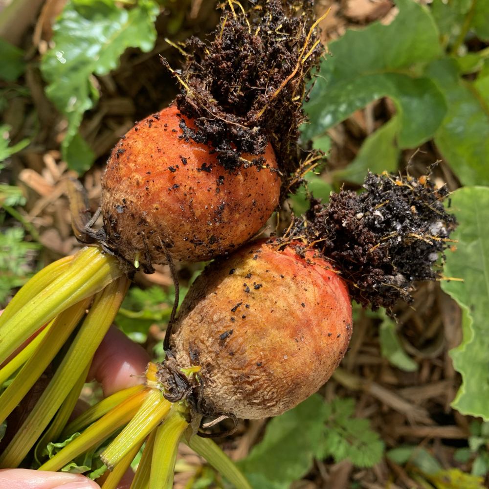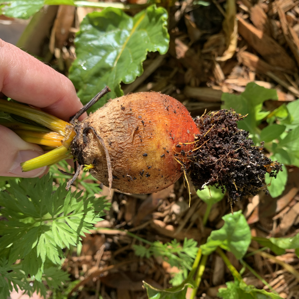 Beets will grow in little clumps of 2 or 3, and need to be thinned. I cut off the extras, leaving the roots undisturbed.