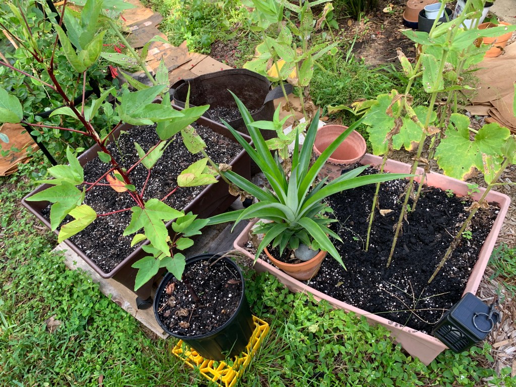 The Roselle plants are looking awesome and I should have some red pods for tea soon. (Yup, I’m beginning to pick the pods.)
