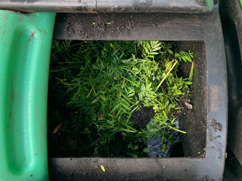 Chopping up the Marigolds and adding to the composter -My Hot Frog.
