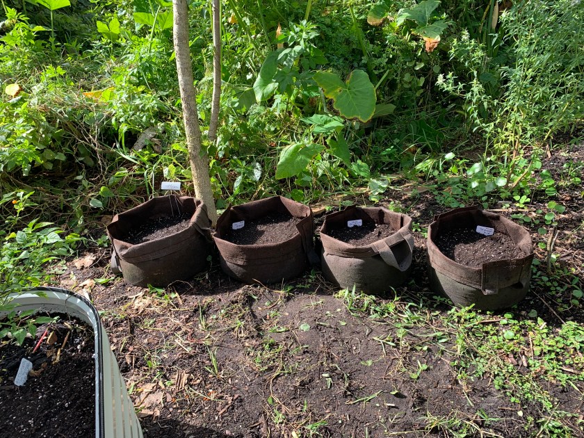 Fabric bags have been filled half full and onion seeds have been planted. Onions don’t have such long roots. I’m filling all my bags part way and rolling down the sides. They are planted with Texas Grano bulb onions.
