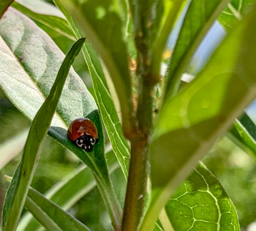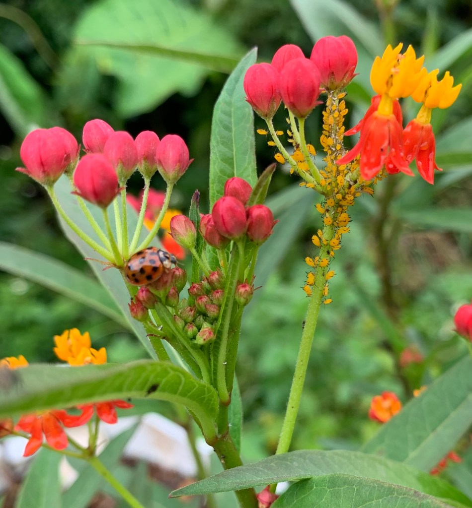 Milkweed attracts aphids, and ladybugs love to eat aphids. This works very well in the wild, I would imagine, where lawns are not sprayed and things work together as they should. Wild areas are disappearing. Now, we have to grow milkweed in our gardens, and that can bring ladybugs.