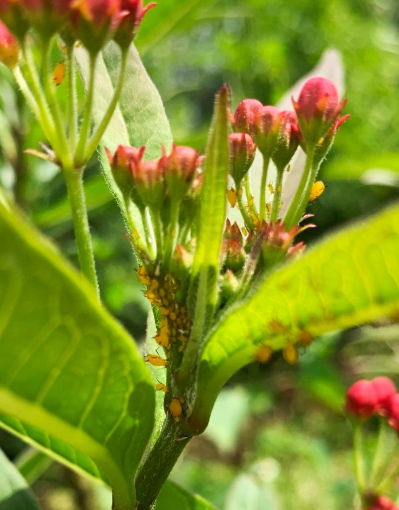 Yellow aphidsLadybug & aphidsAphids on white Swamp MilkweedTropical milkweed plant, has flowers of two colors