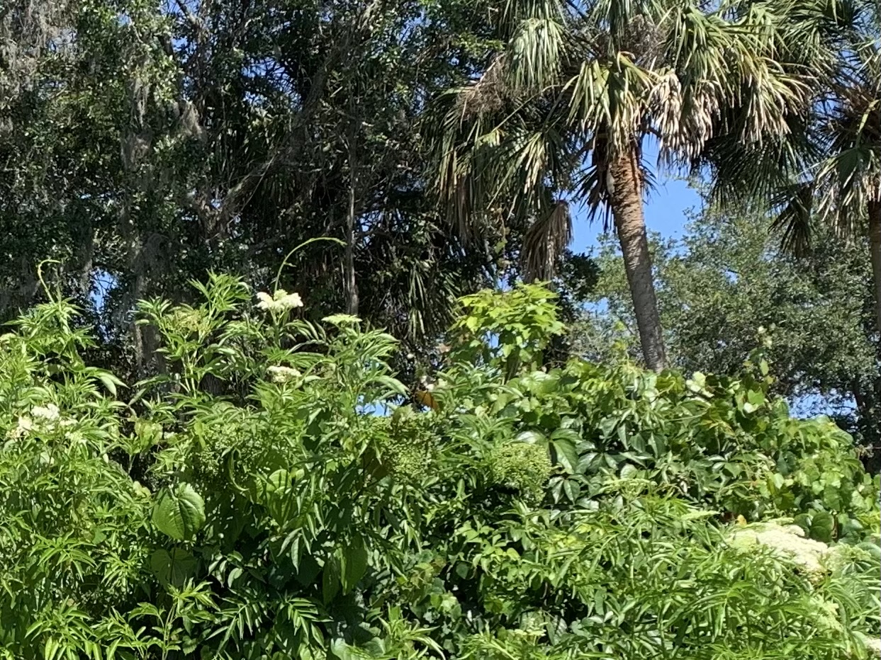 On the lot next door, there is also a Beautyberry and an Elm tree side by side. However, both are covered in vines . The only reason I realized there is a beauty berry in that clump is that I went in to remove the vines (failed) and found new growth at the base of the bush.