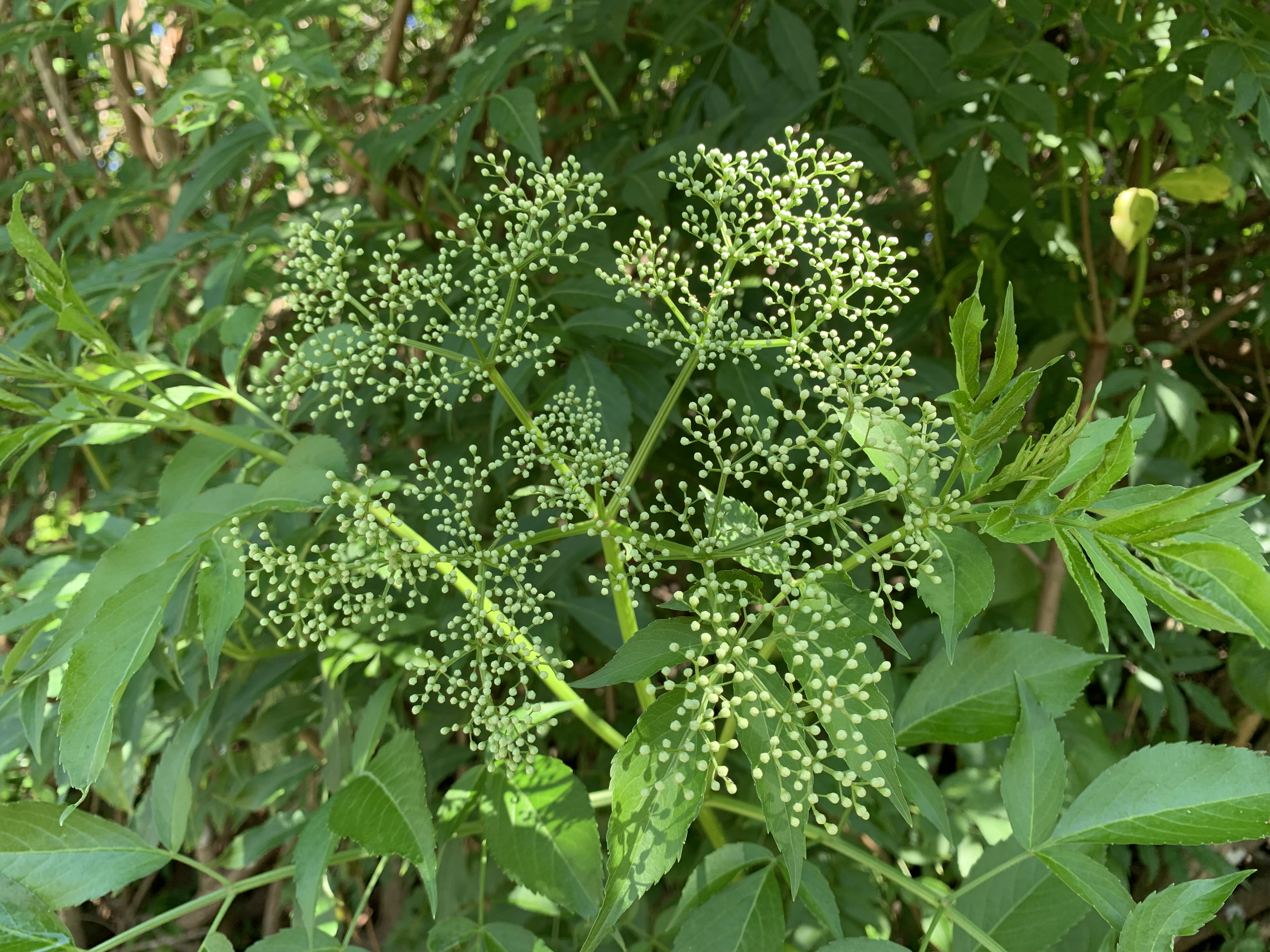 The lot next door is full of elderberry shrubs. Now they are all blooming and the white flowers are very noticeable.