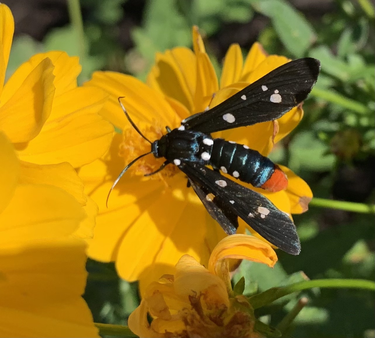 Previous Image Next Image colorful bee Polka Dot Wasp Moth Polka dot wasp moth is colorful with white spots on wings and body which is blueish with a reddish orange end. Thank you for sharing!Tweet Click to share on Bluesky (Opens in new window) Bluesky MoreShare on TumblrLike Loading...