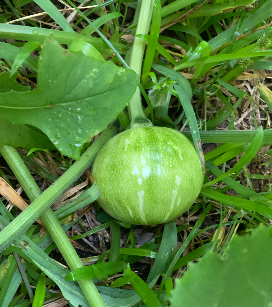The watermelon vines have 1 watermelon. The pumpkin vines – well, I mentioned that above. Those vines have nearly made it from the back of the house to the front. They’ve dropped about 10 pumpkins at this point.