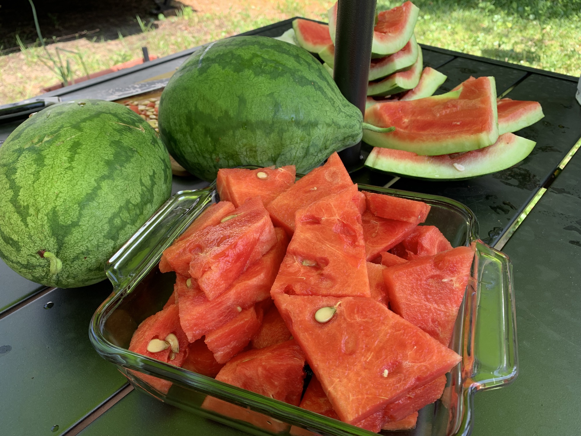 I had to pick my watermelon because the stem area was beginning to rot, for some reason. But, I also discovered watermelon #2 hidden under the vines. I covered it with pine needles to try to keep the raccoons away. I like to kid myself that I can outsmart them.