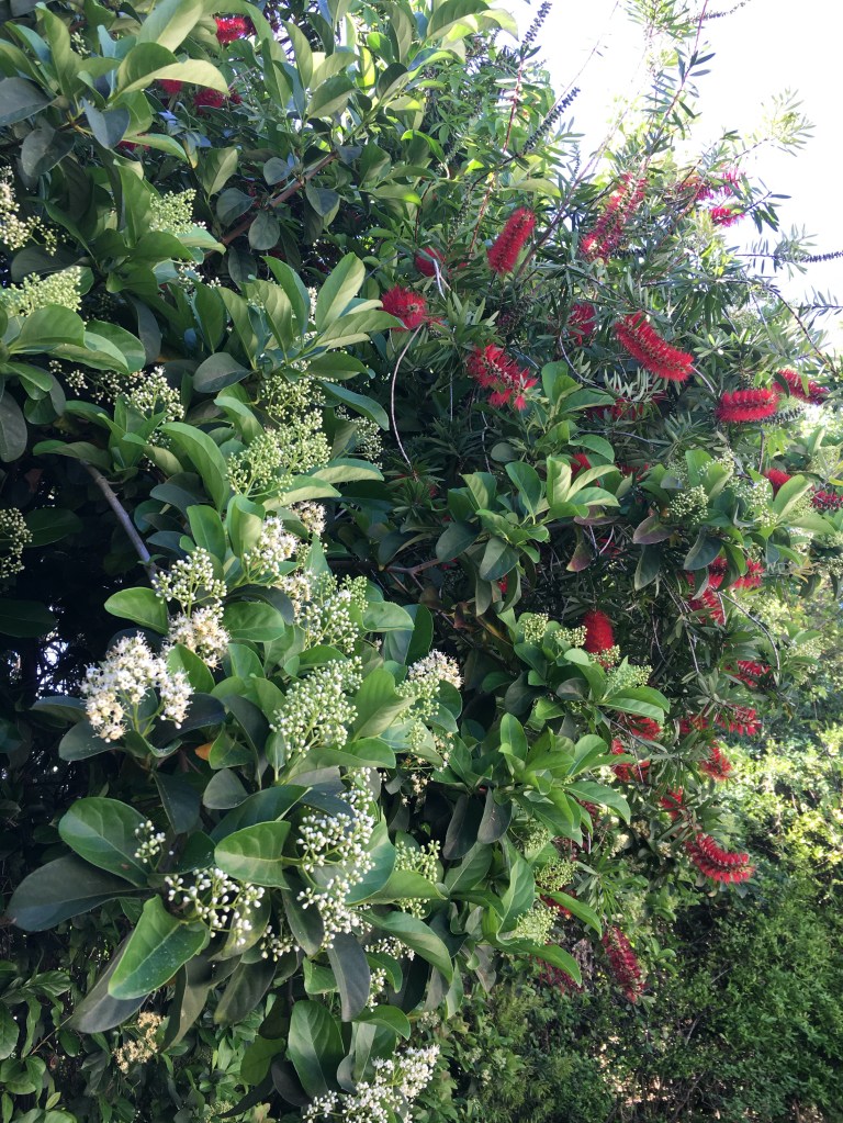 Along the back of my lot an overgrown shrub border contains a couple of bottlebrush trees.