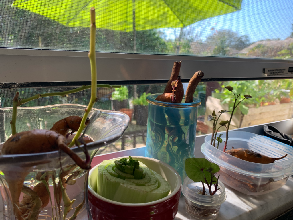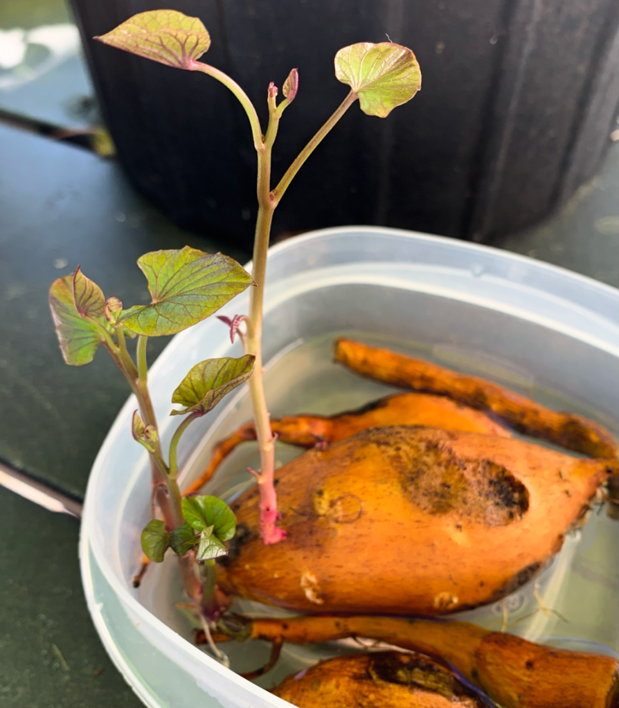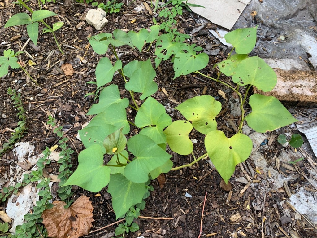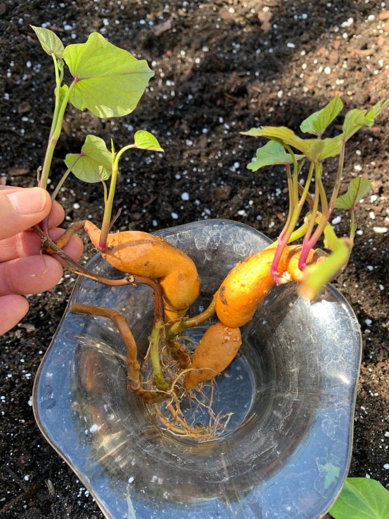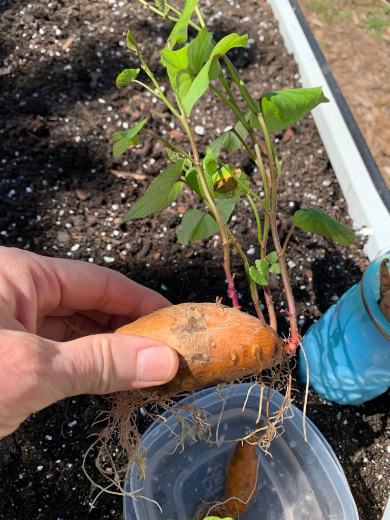I’ve had some sweet potato slips growing on my windowsill for a few weeks. I kept finding sweet potatoes buried in the yard that were rooting. They really needed to get into the ground. Our weather is not super hot yet, but I figure the plants are better off in dirt than in water in my house. Also, we have an upcoming camping trip. The goal is to plant things before I leave.